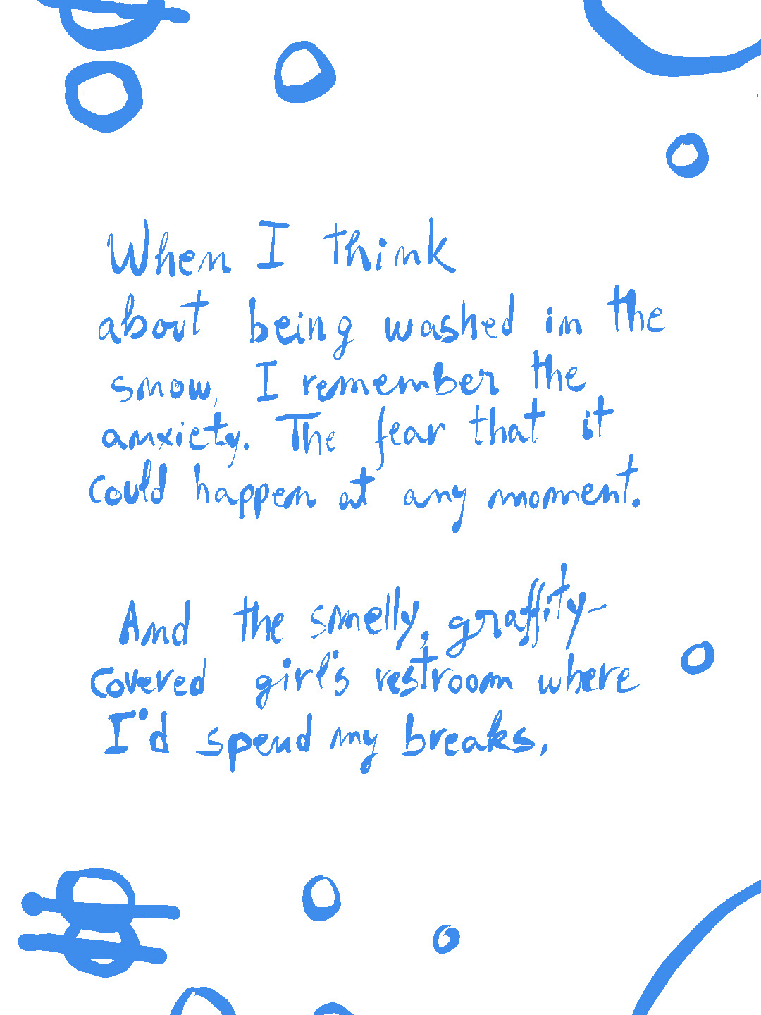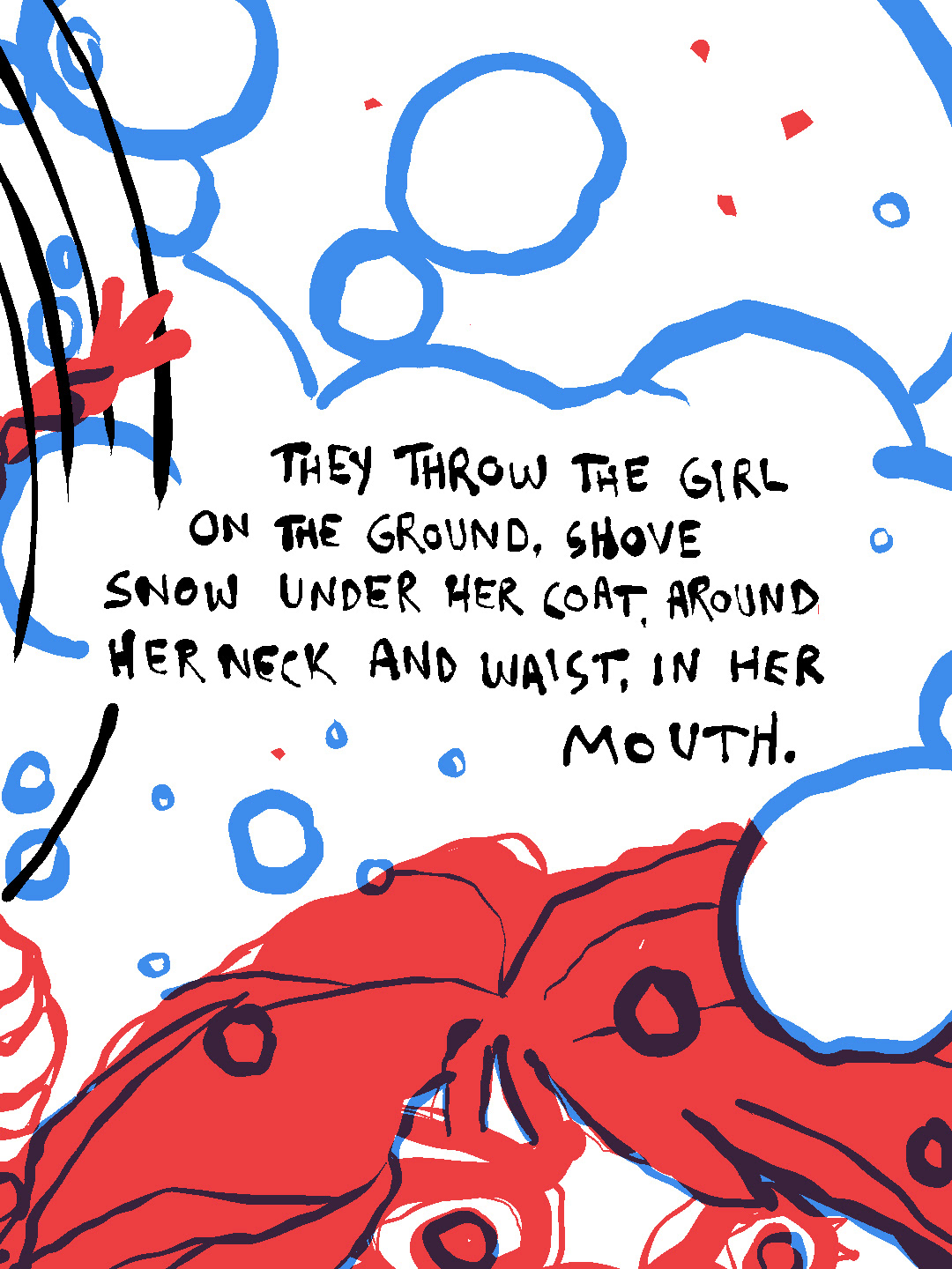 A short comic about a time in the late nineties and early aughts when growing up as a girl in Romania was not easy, to say the least. The 'tradition' of washing girls in the snow was a violent game played by boys with the forced participation of their girl classmates or friends, both in and out of the schoolyards, that was in full bloom when I was growing up, but seems to have faded in the years since.